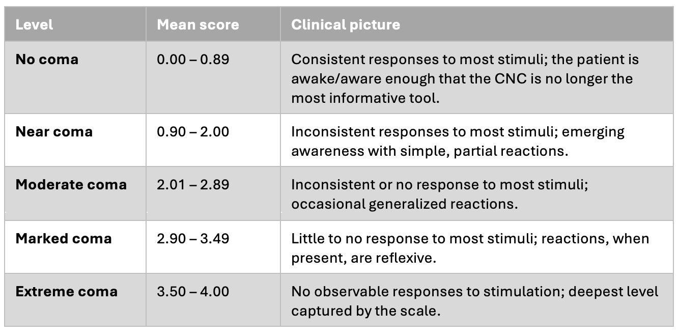 Where the GCS asks “is the patient in coma?” and the CRS-R asks “what level of consciousness is emerging?”, the CNC zooms in on the bottom of the curve. It was designed to give clinicians a way to document the kind of incremental, day-to-day movement that families and bedside staff so often notice but that broader instruments miss.