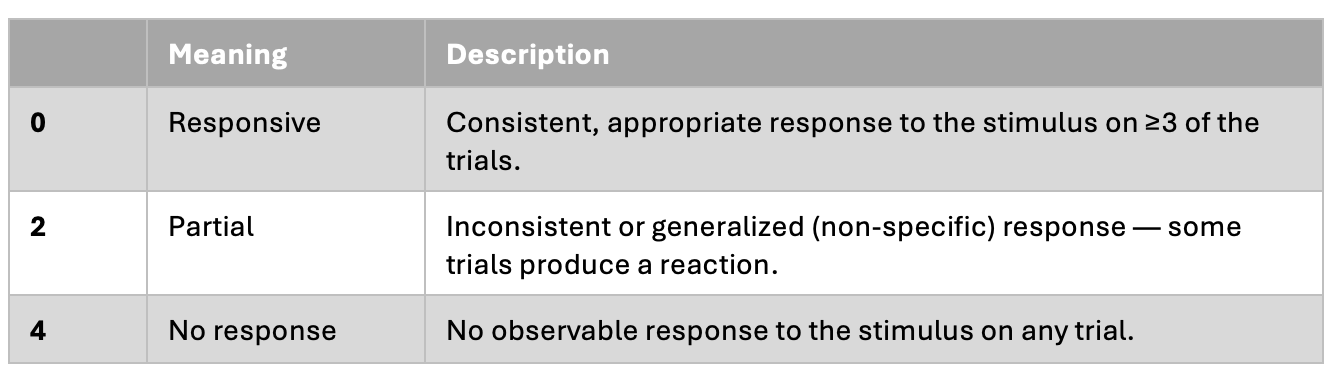 Each item delivers a standardized sensory or motor stimulus and asks the examiner to rate the most meaningful response observed across repeated trials.