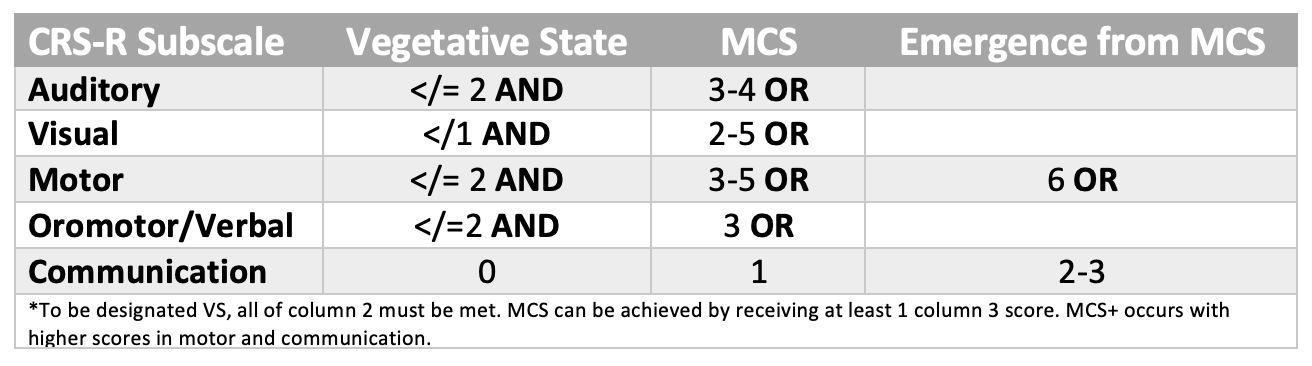 Standardized based on the presence or absence of operationally-defined behavioral criteria. The behavioral response must be clearly discernible before they are scored present. A score of 10 or greater indicates a diagnosis of Minimally Conscious State (MCS) or emergence from Minimally Conscious State (eMCS). Minimum score: 0 / Maximum score: 23
